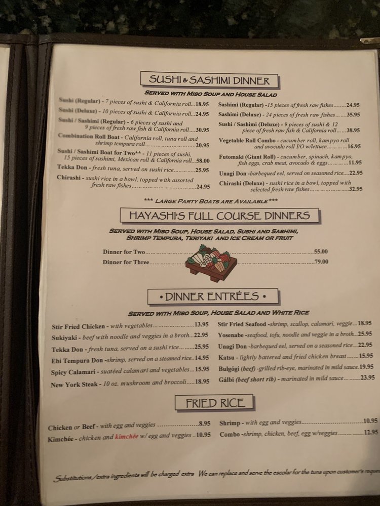 Hayashi Japanese Restaurant, located in Palm Beach Gardens, FL, offers a delightful blend of Japanese and Korean cuisine. With a range of appetizers like age tofu, beef negimaki, and hamachi carpaccio, the menu showcases a variety of flavors and textures. Their curry dishes, including beef, chicken, and shrimp options, are sure to satisfy any craving for something hearty and savory. For dessert, indulge in banana tempura with vanilla ice cream or the unique mochi ice cream flavors. Customers rave about the consistently delicious and fresh food, along with the attentive and friendly staff. Whether you're looking for a quiet dinner or a group gathering, Hayashi Japanese Restaurant provides a casual yet sophisticated dining experience with flavorful dishes that will leave you craving more. Don't miss out on this hidden gem in a strip mall for a truly delightful culinary experience.